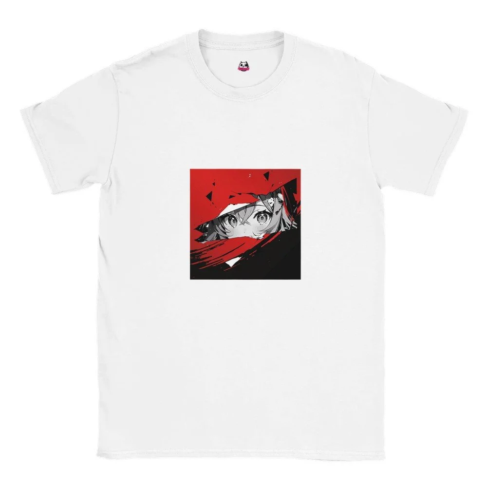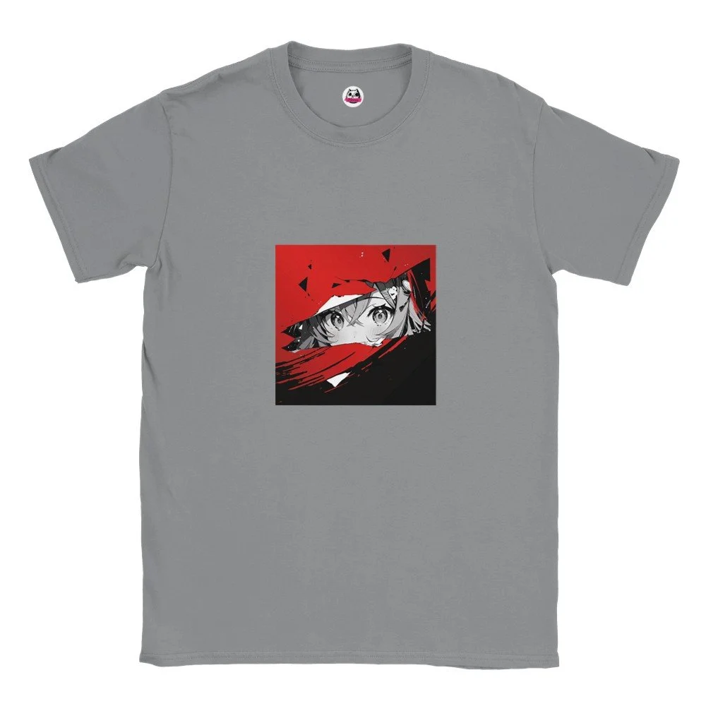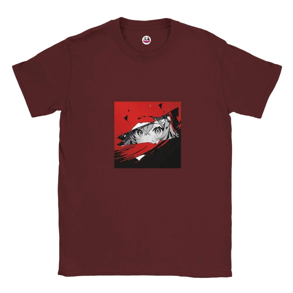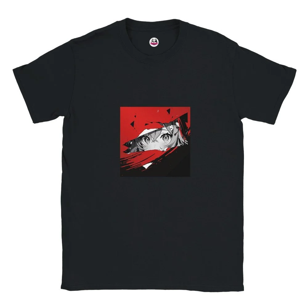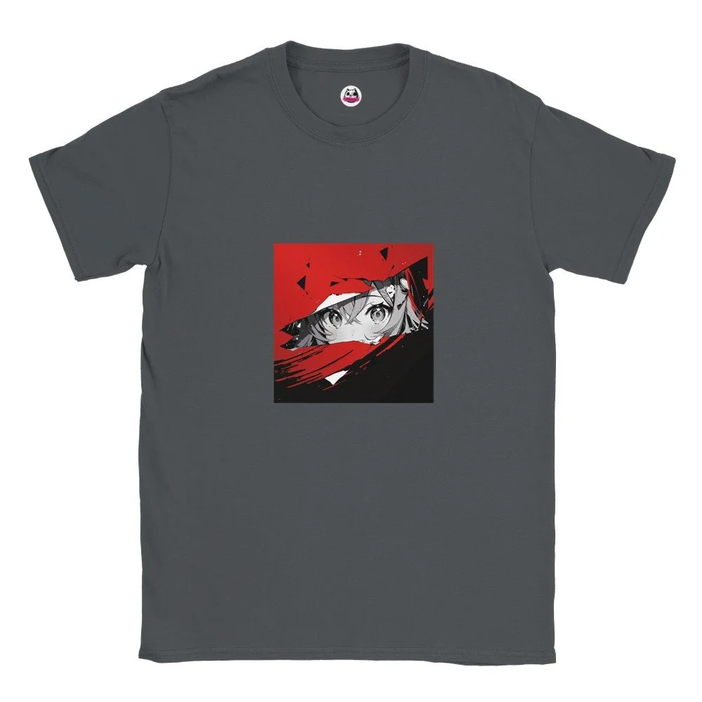 Intensiver Anime-Blick in Rot-Schwarz, ein markantes Streetwear-Piece für echte Fans.