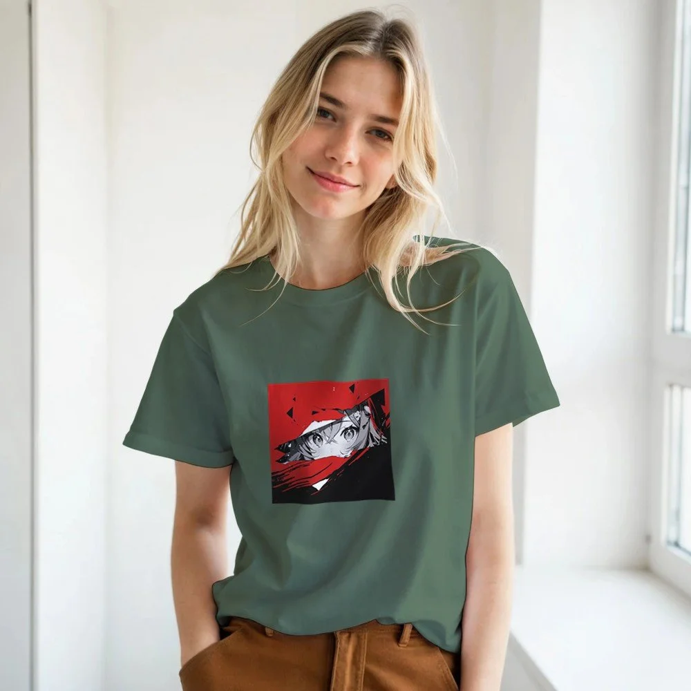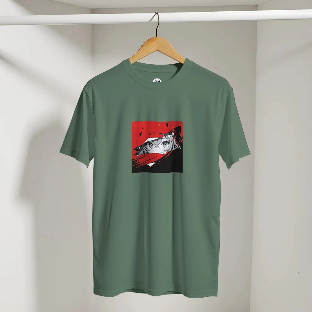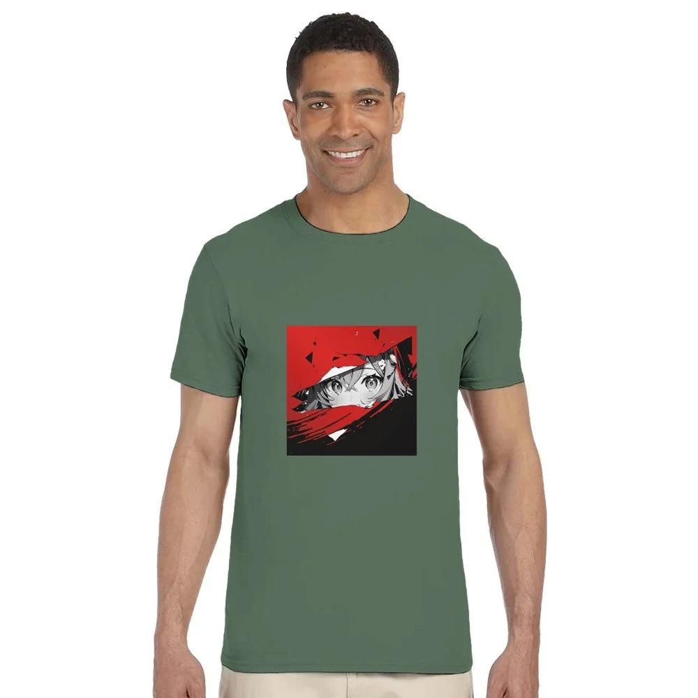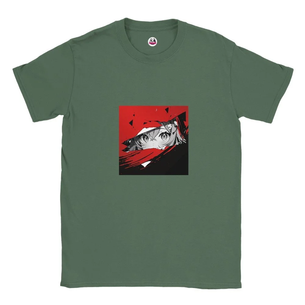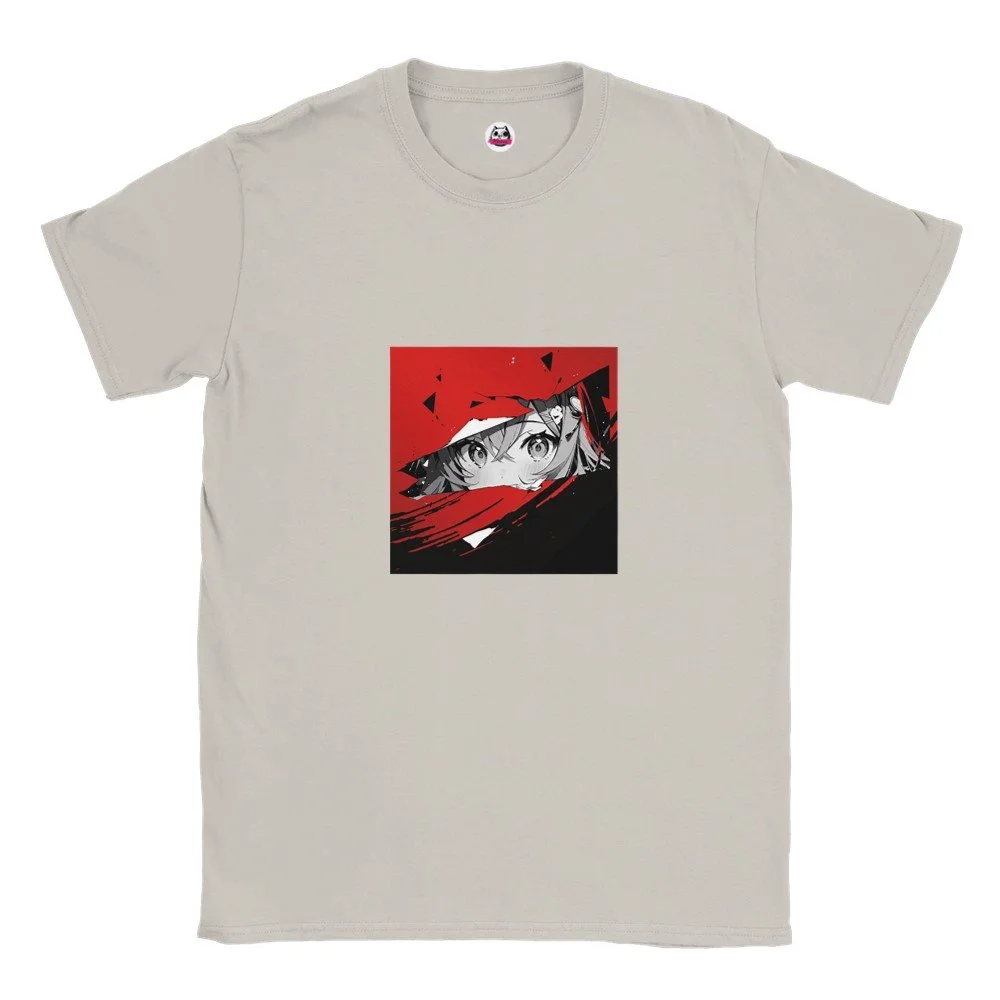 Intensiver Anime-Blick in Rot-Schwarz, ein markantes Streetwear-Piece für echte Fans.