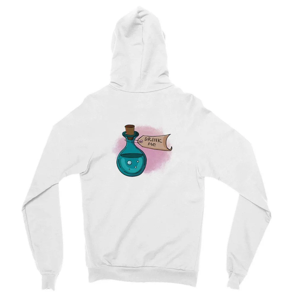 Finde das weiße Kaninchen 🐇 und folge ihm ins Abenteuer! Vorne das ikonische Bunny, hinten die magische „Drink Me“-Flasche. Ein Must-have für alle Wonderland-Fans.