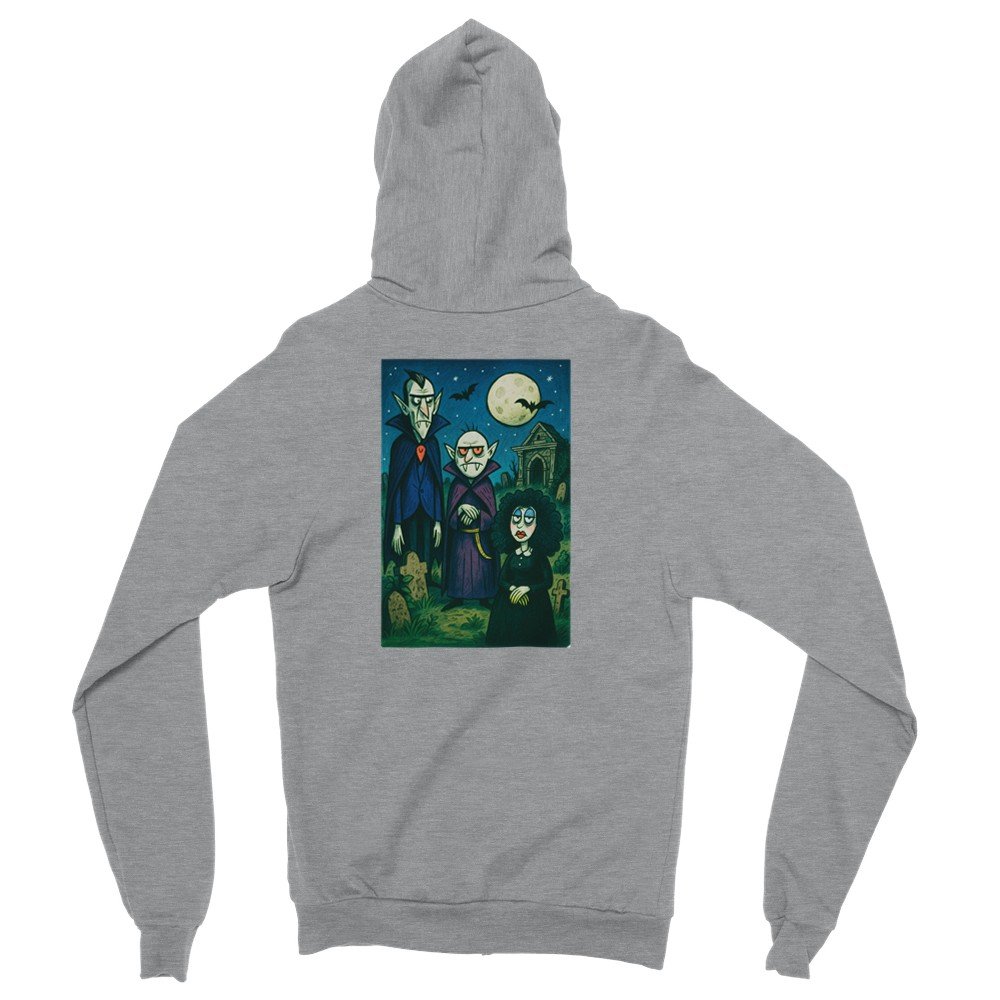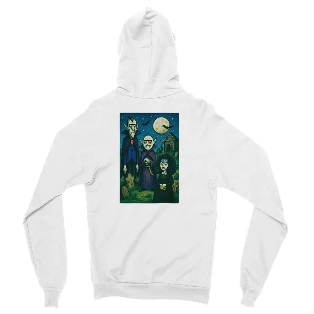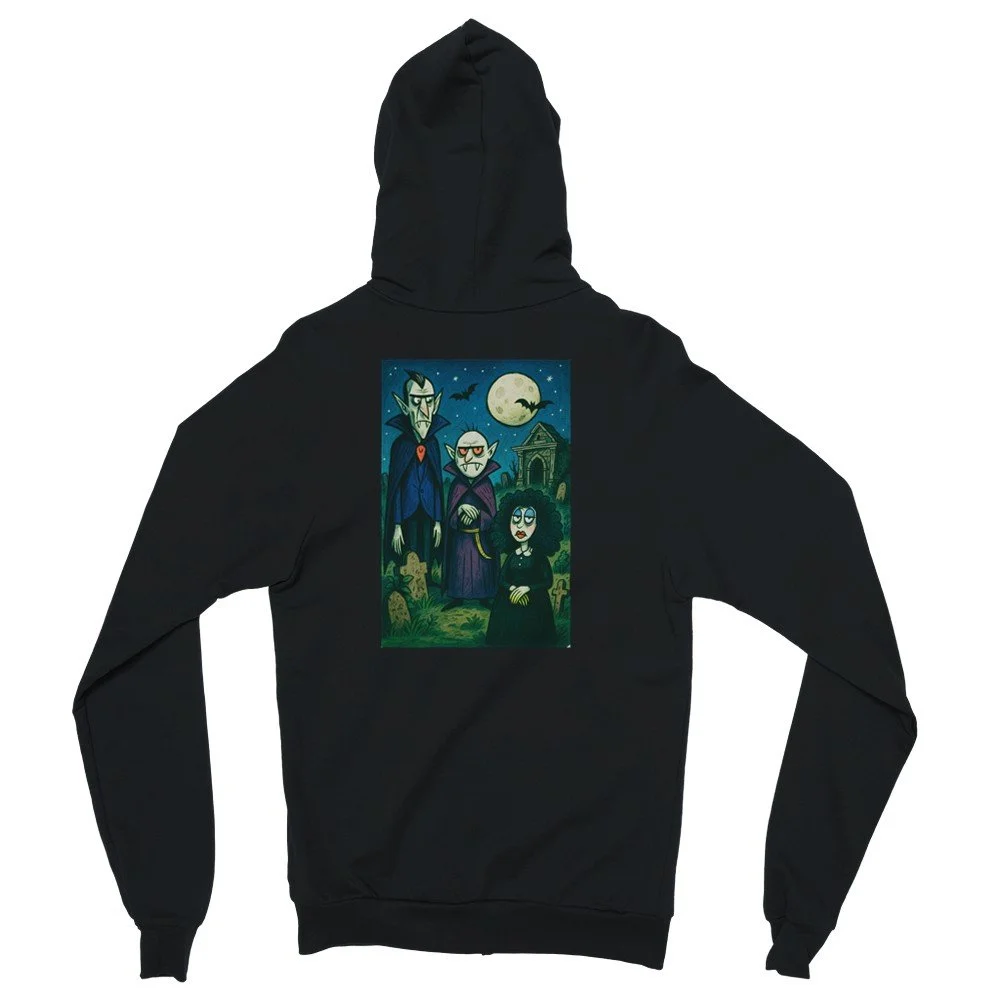 Kleines Sarg-Symbol vorne & gruselige Vampirfamilie im Mondschein hinten.