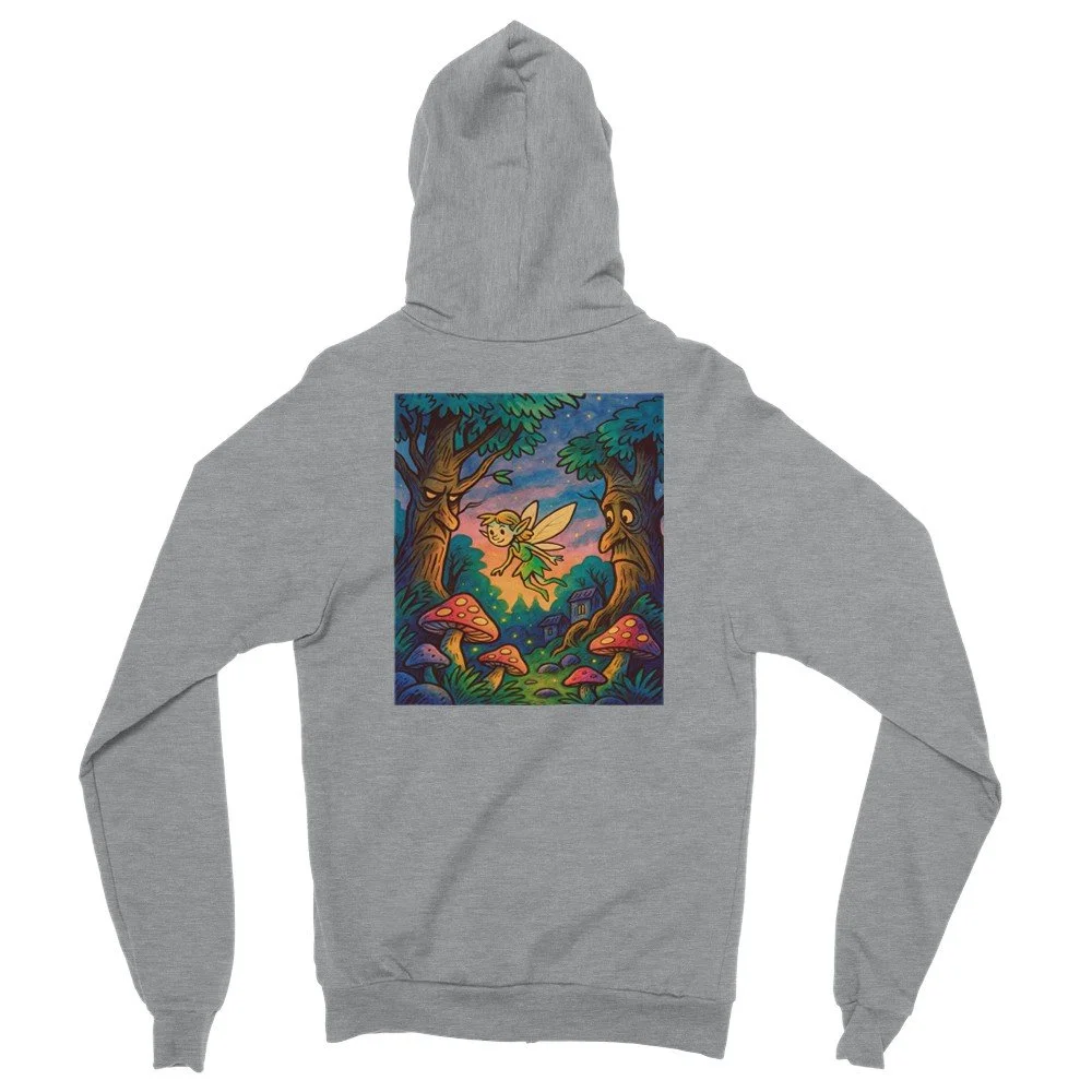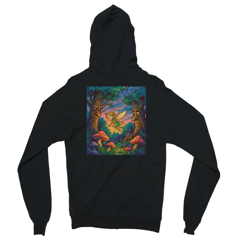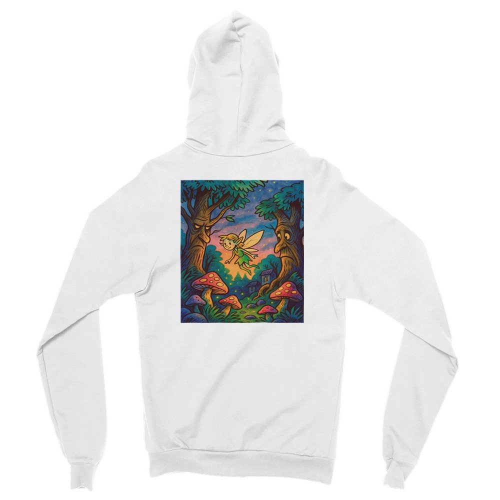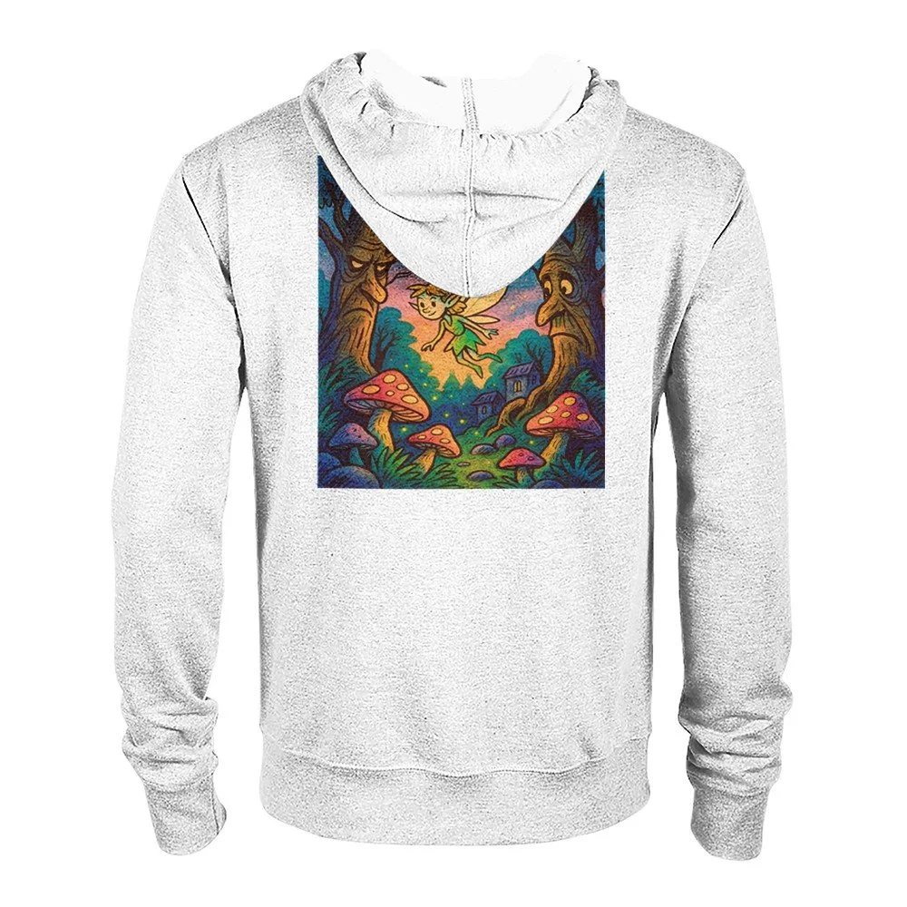Frontprint mit Pilz, Rückenprint mit Elfe, Bäumen und magischem Sonnenuntergang.