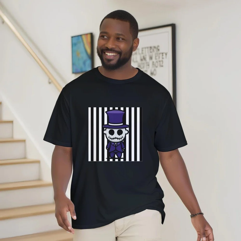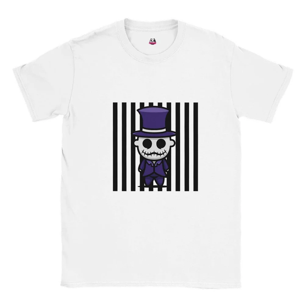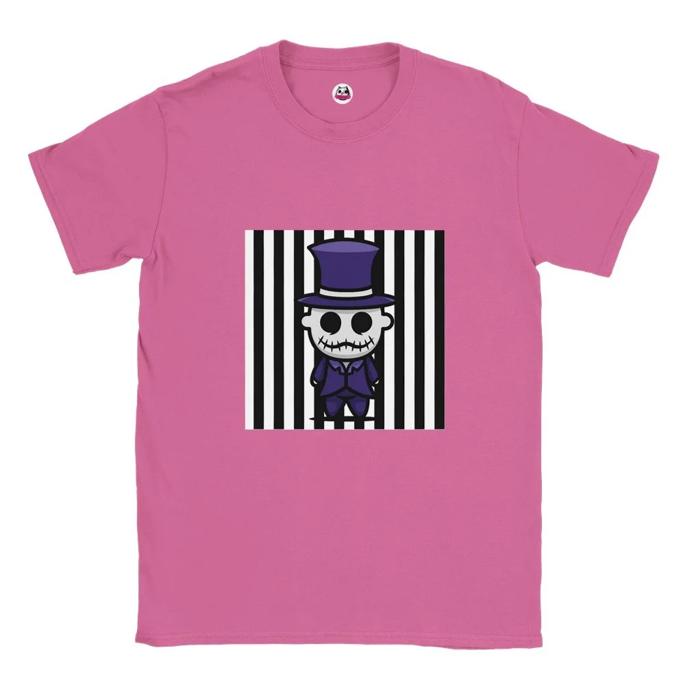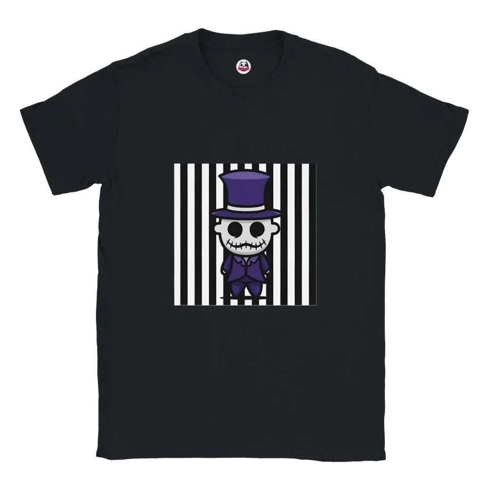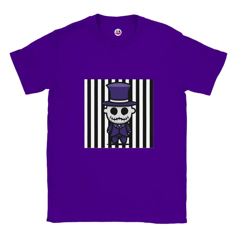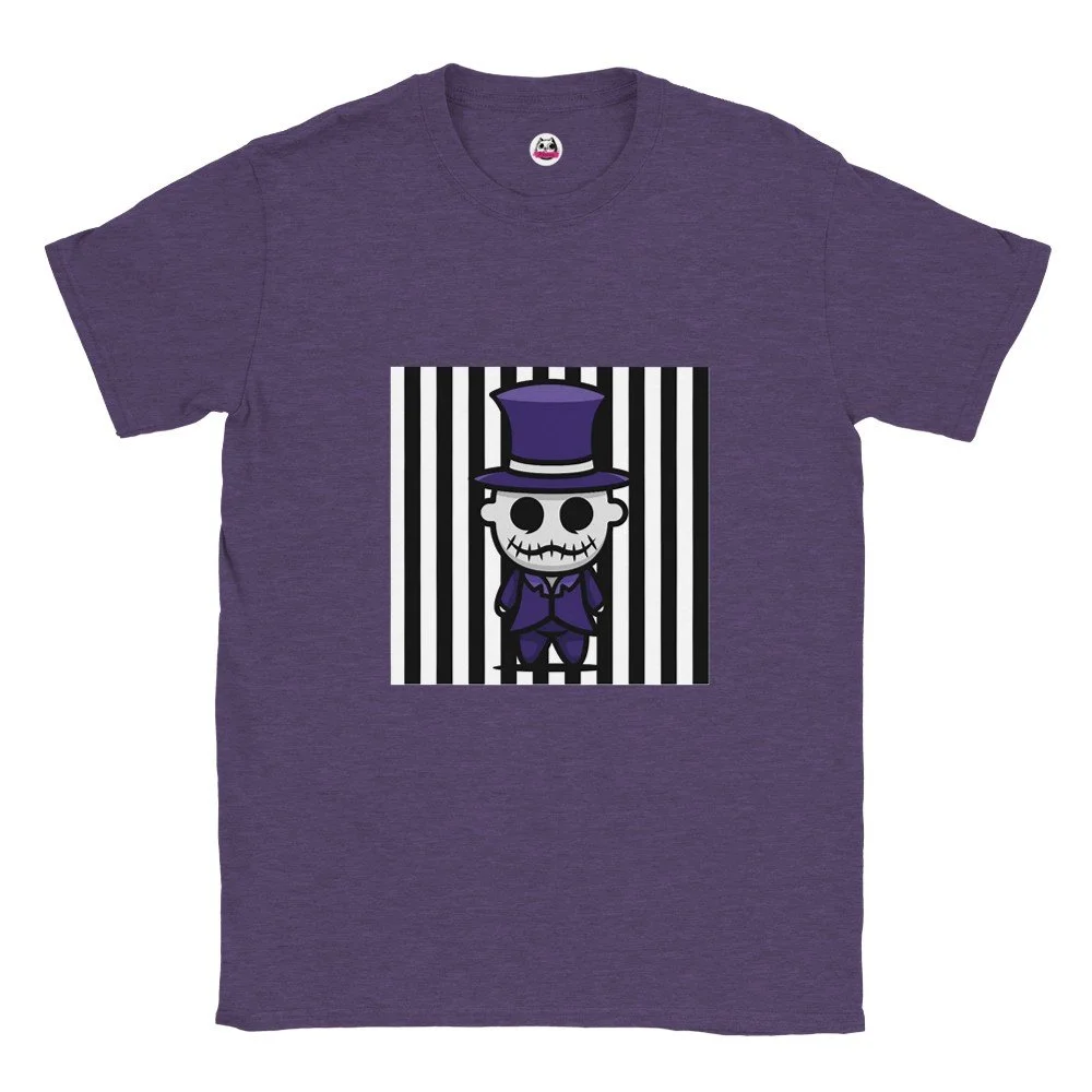 Ein echter Hingucker für alle, die dunklen Stil mit Humor verbinden! Dieses T-Shirt zeigt einen stilisierten Skelett-Gentleman im violetten Frack und Zylinder, elegant, charmant und ein bisschen unheimlich. Der grafische Look mit schwarz-weißen Streifen verleiht dem Design eine moderne, individuelle Note.