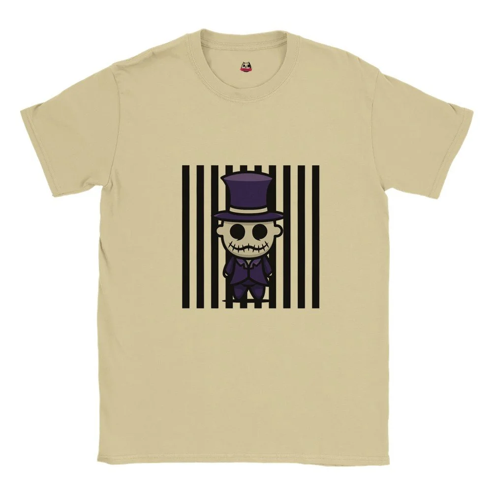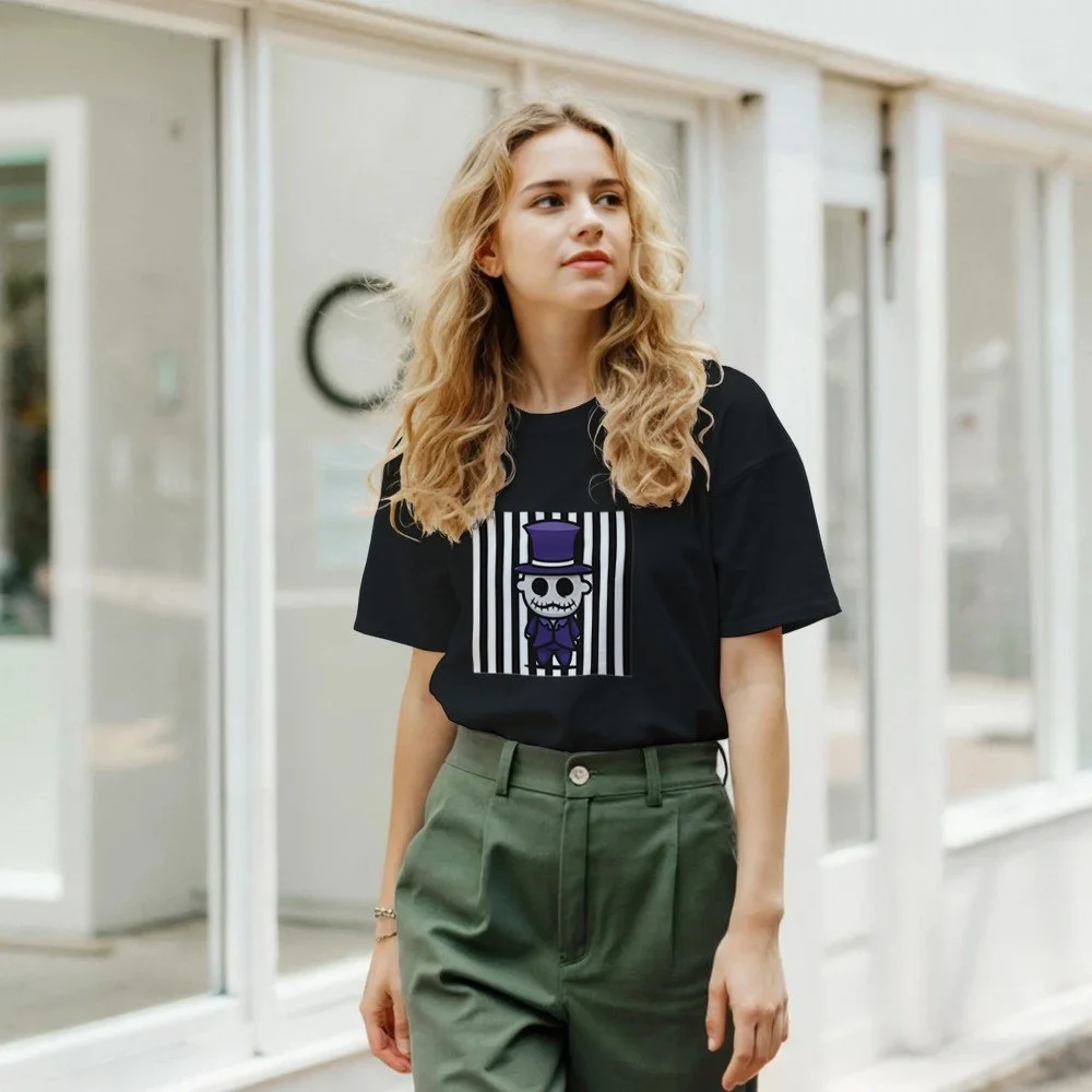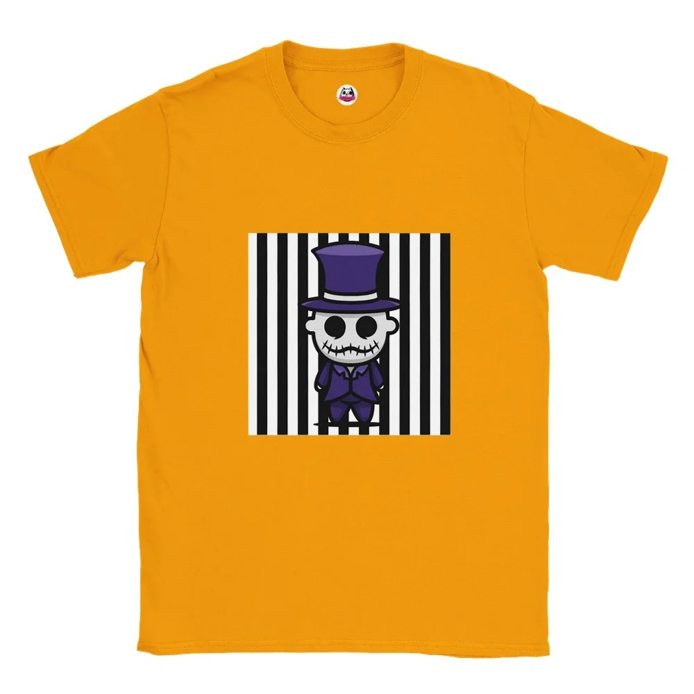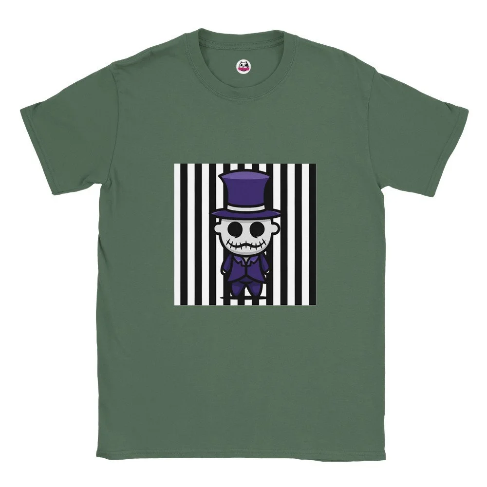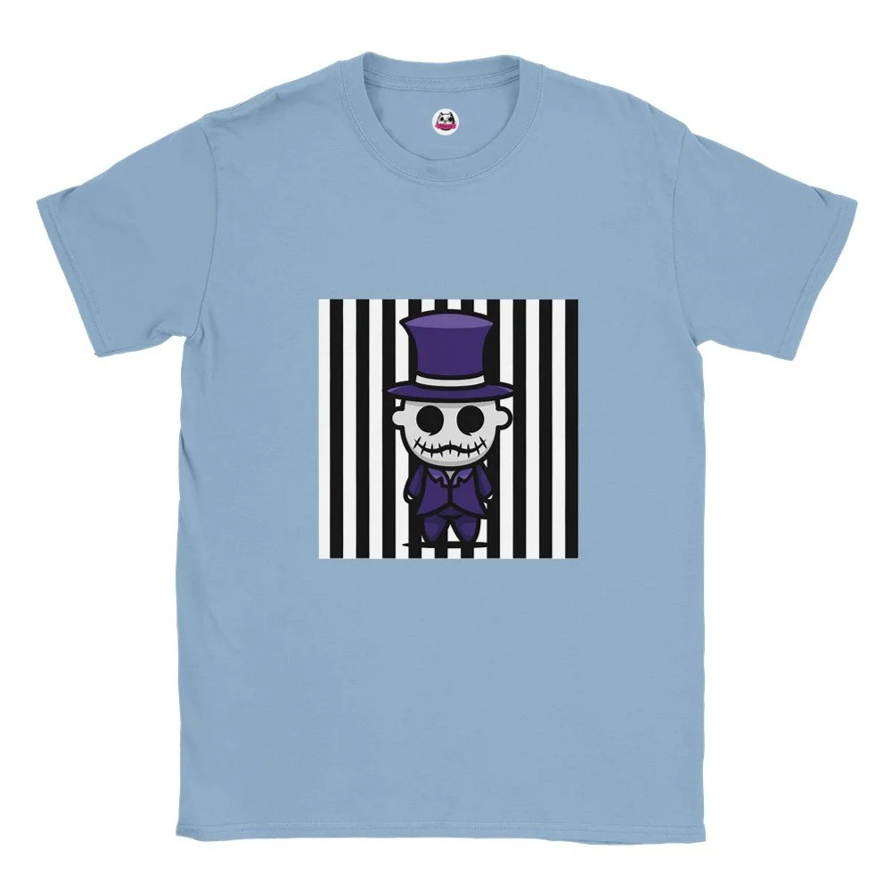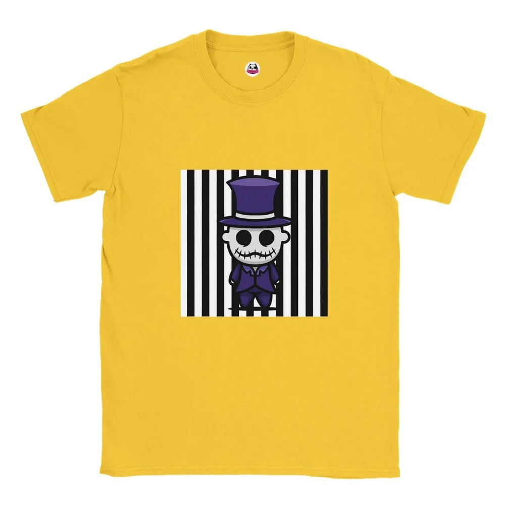 Ein echter Hingucker für alle, die dunklen Stil mit Humor verbinden! Dieses T-Shirt zeigt einen stilisierten Skelett-Gentleman im violetten Frack und Zylinder, elegant, charmant und ein bisschen unheimlich. Der grafische Look mit schwarz-weißen Streifen verleiht dem Design eine moderne, individuelle Note.
