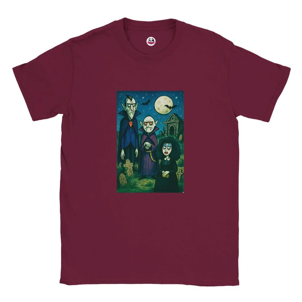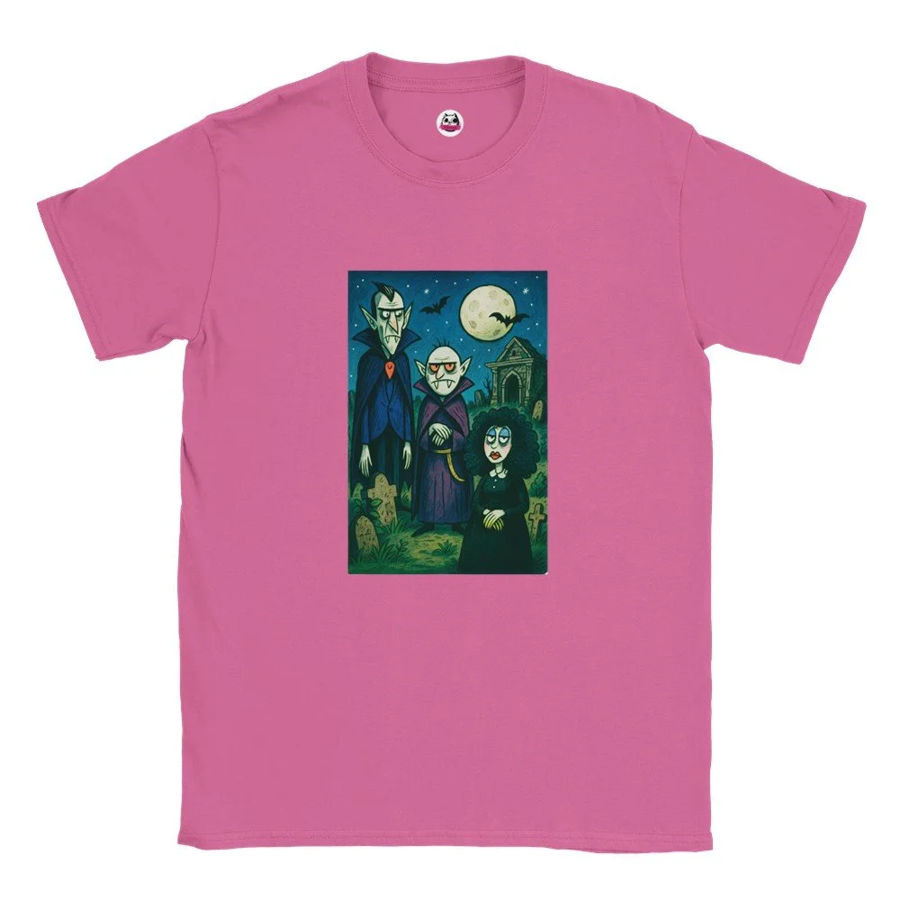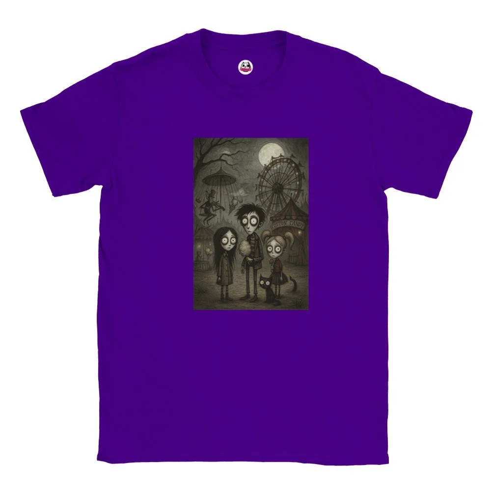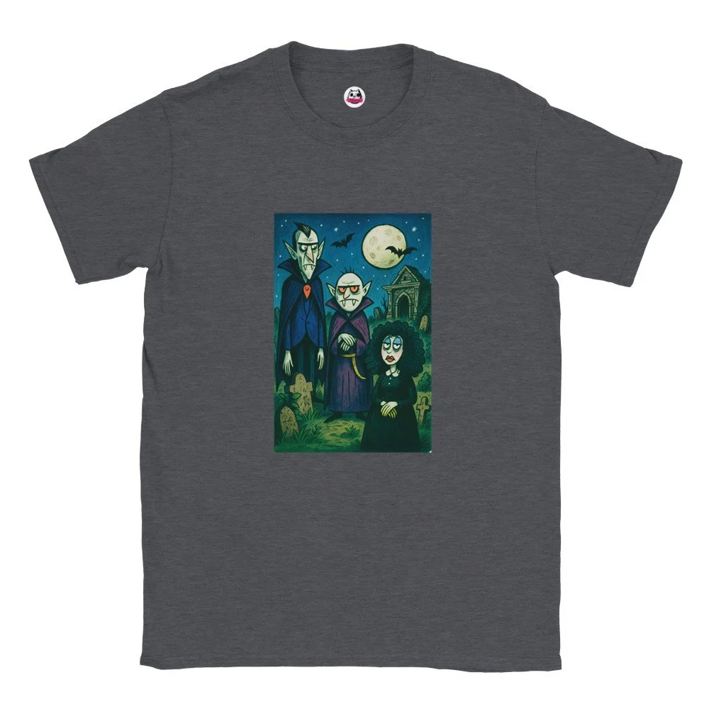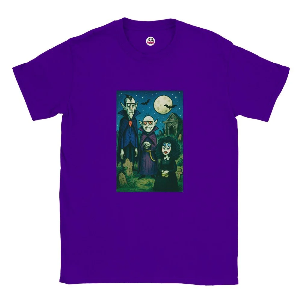 Ein echter Hingucker für alle, die dunklen Stil mit Humor verbinden! Dieses T-Shirt zeigt einen stilisierten Skelett-Gentleman im violetten Frack und Zylinder, elegant, charmant und ein bisschen unheimlich. Der grafische Look mit schwarz-weißen Streifen verleiht dem Design eine moderne, individuelle Note.